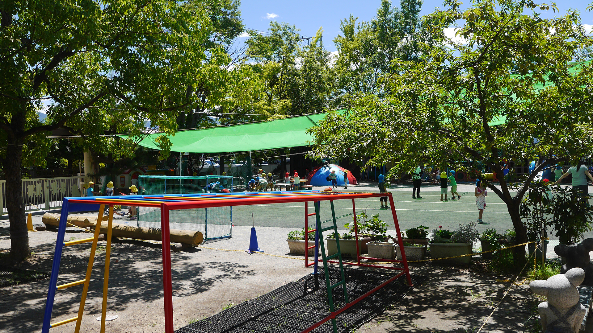 本園は昭和50年4月に現在地に開園しました。甲府市の東部に位置し、周囲にはぶどう畑もあり、自然豊かで閑静な地域の中に位置しています。平成17年7月には新園舎が完成しました。園庭は芝生広場や、りんご、柿、プルーンなど果物のなる木やくぬぎ、ケヤキ、桜、銀杏などの大樹に囲まれ、その中に大型遊具や丸太小屋をはじめとする子供たちの遊び道具が点在している、そんな環境の中で、ステキな子供たちと生活しています。